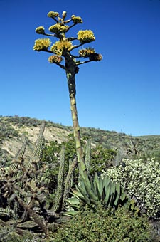 The generic name refers to the Greek Agaue which is a proper name meaning the noble or illustrious one. DescriptionThis agave is a perennial fleshy plant that has gray-green lance shaped leaves 10-18 cm (4-8 inches) wide and 40 to 70 cm (16-28 inches) long. The leaves have marginal teeth 10-15 mm (1/2 inch) long and spine-like tips 3-4 cm (1-1/2 inch) long. The plant grows to 1 m (3 feet) tall and after several years produces a flower spike 3-5 m (9-15 feet) tall. The yellow flowers open from September to May and are carried on a long stalked inflorescence that has a pyramidal arrangement to the flower clusters and produces 18-25 lateral branches. This subspecies has longer, lighter green leaves and a more pyramidal top of the inflorescence than A. shawii spp. shawii. Range and Habitat This agave is found in central Baja California area from El Rosario inland and to the east along the Pacific slopes and south to Vizcaíno Bay.