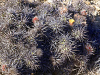 DescriptionThis cactus is grows approximately 0.2-0.3 m (7 to 11 inches) high. Club Cholla has deep green club-shaped joints that are 12 cm (5 inches) long. The spines are thick and strongly flattened, 1- 5 cm (1/2 to 2 inches) long, and are at first bright red at the base, turning grayish-white and finally black. The flowers have yellow petals and bloom from April to May. Range and HabitatClub Cholla grows in silty, sandy, or gravelly soil near the coast from the Vizcaíno Desert Region to just north of the Cape Region. Natural HistoryThe Club Cholla is a mat forming cactus and is also know as "Horse Crippler" and "Rat House." The name rat house has been given because it provides protection to various rodents who build their burrows under this plant. |